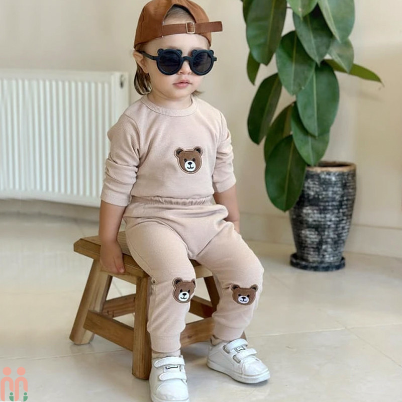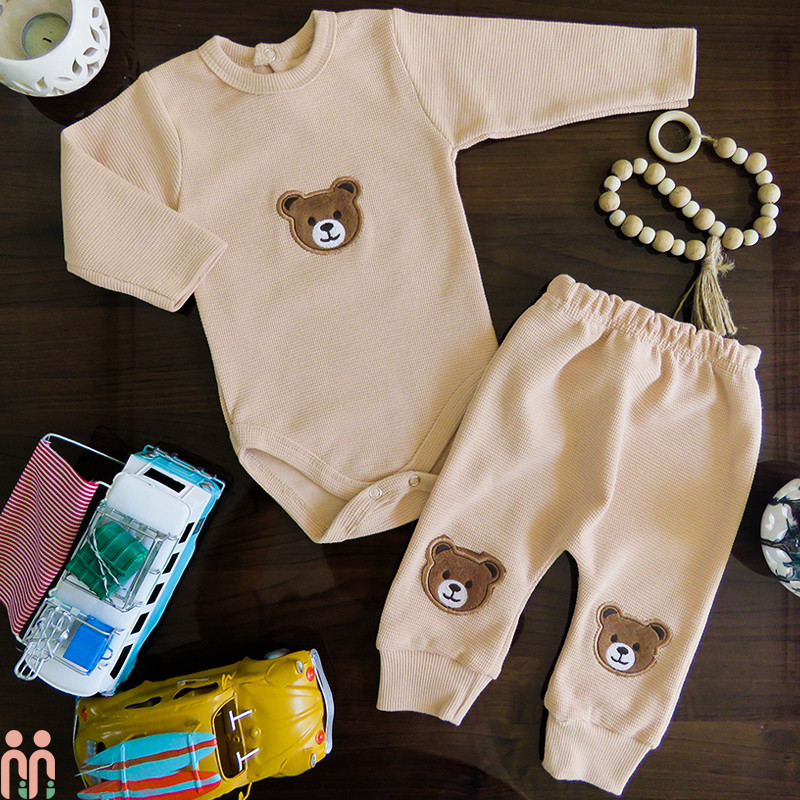 بادی زیردکمه دار و شلوار نخی بیسکویتی نسکافه ای تدی kids teddy bodysuits and pants