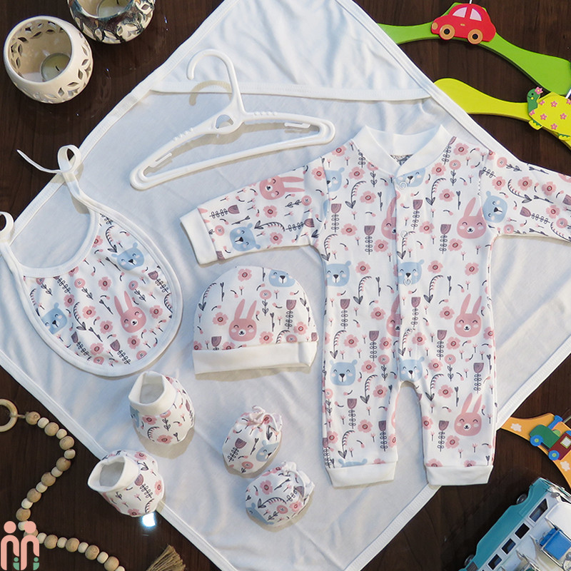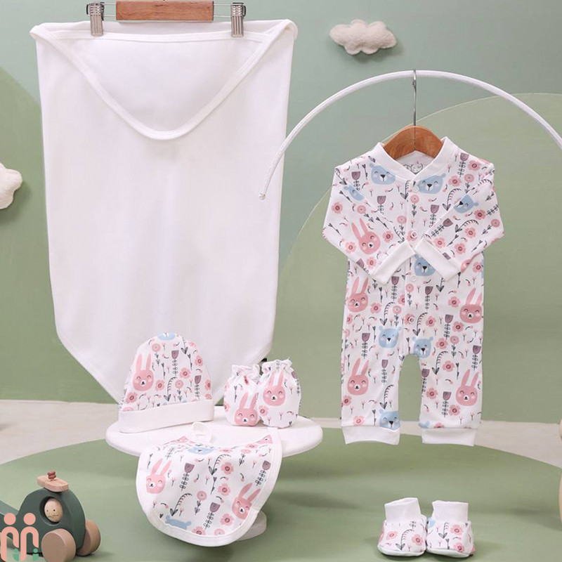 ست لباس بیمارستان نوزاد دخترانه 7 تکه نخی اعلا خرگوش صورتی Baby born clothes set