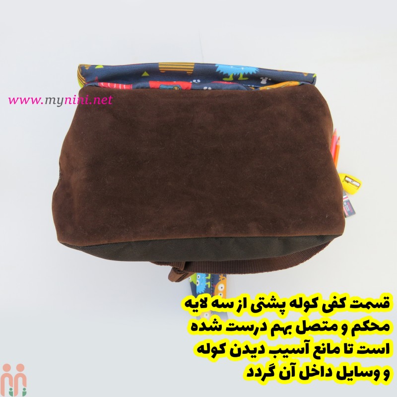 قسمت پشتی کوله پشتی که در تماس با کمر کودک می باشد، 3 لایه است و با الیاف نرم پر شده است تا به کمر کودک بخاطر وجود وسایل داخل کوله ضربه ای وارد نشود و کودک هنگام حمل آن احساس راحتی داشته باشد