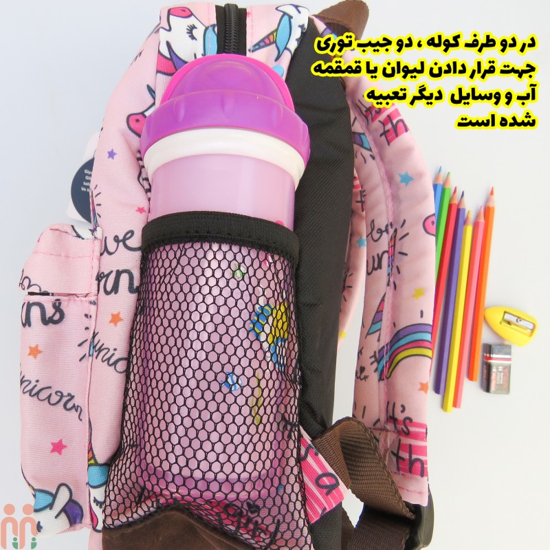کوله پشتی دخترانه دارای جیب بزرگ در قسمت رویی جهت سهولت در استفاده از کوله توسط کودک و همچنین دارای دو جیب توری محکم در دو طرف کوله جهت قرار دادن قمقمه یا لیوان آب و دیگر وسایل