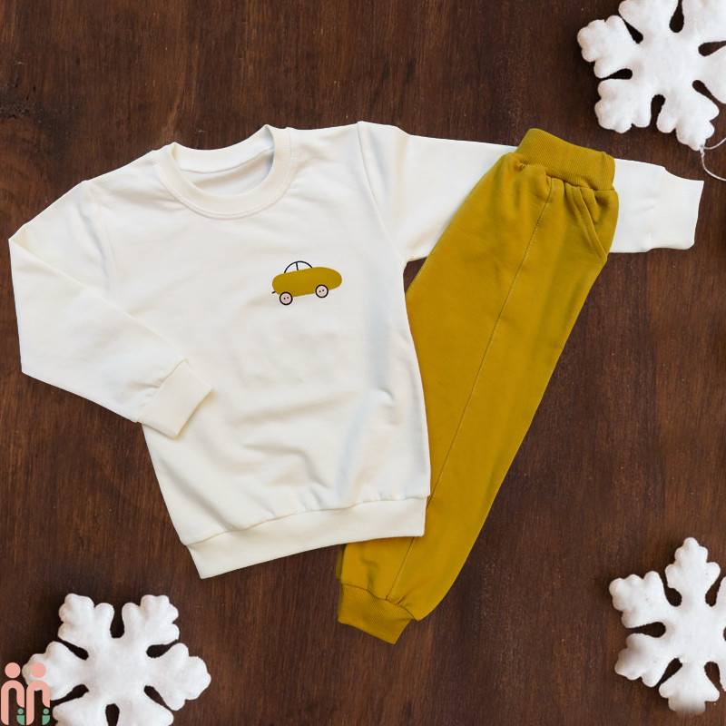 بلوز و شلوار پسرانه 3 تا 4 سال دورس اعلا نخی شیری زرد گلد ماشین Boy car new set clothes